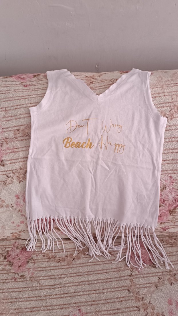 Beyaz renkli, askısız yaka ve salaş kesime sahip kız tişört Etek kısmında püskül detayları ve baskılı 'Beach' yazısı bulunur.