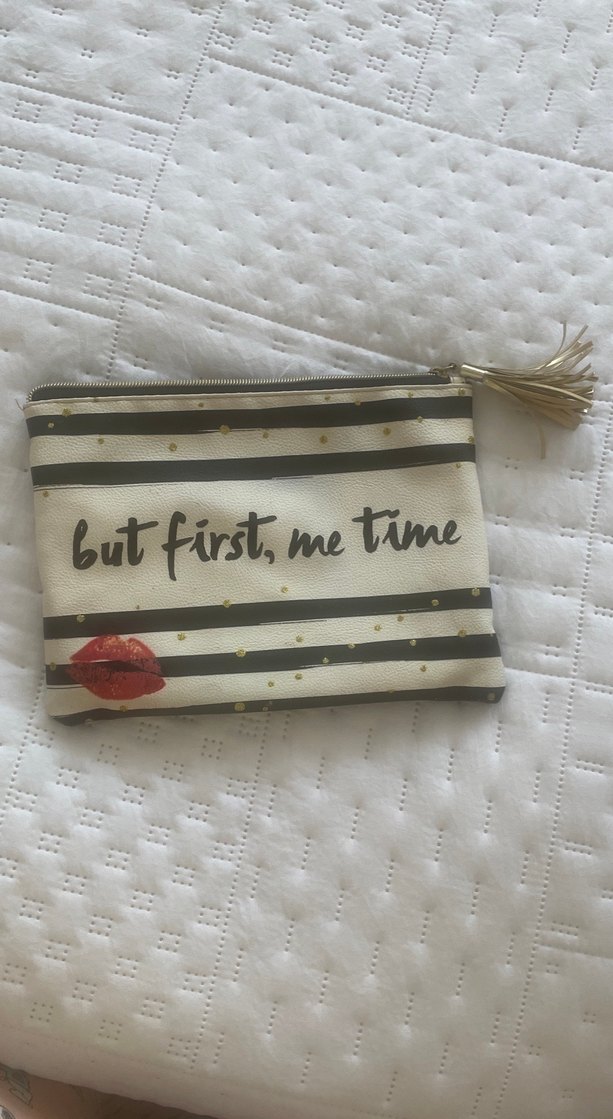Beyaz zemin üzerine baskılı çizgiler ve püskül detaylı bohem tarzda makyaj çantası. Üzerinde "but first, me time" yazısı ve kırmızı dudak baskısı bulunur. ✨
