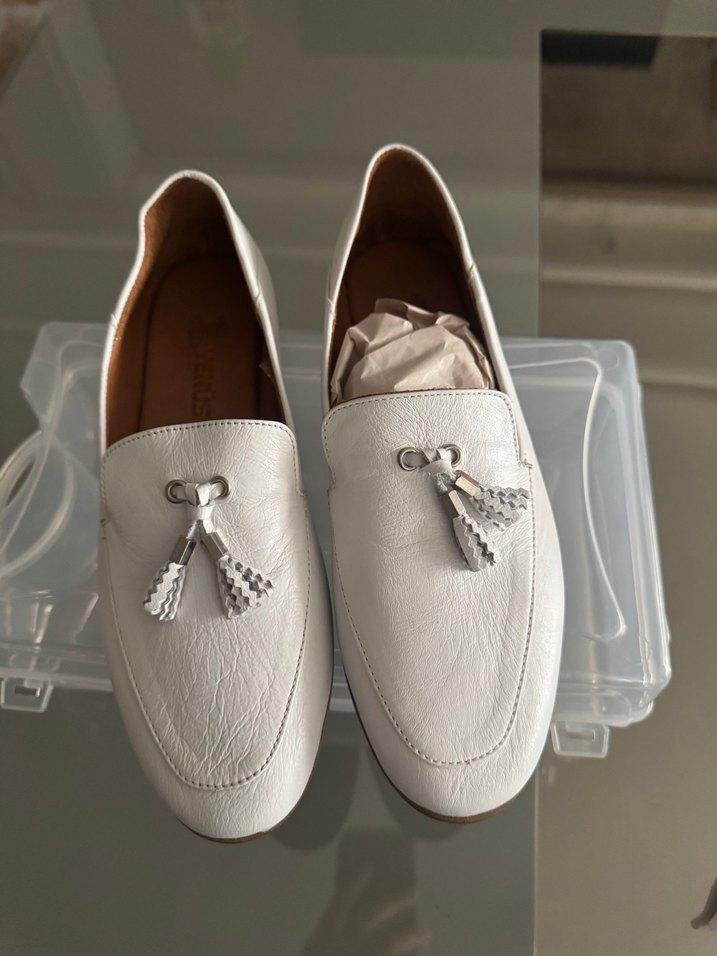 Beyaz deri kadın loaferlar, püsküllü detaylar ve blok topuklu, minimalist ve çağdaş tarzda günlük kullanıma uygun. Gercek deri