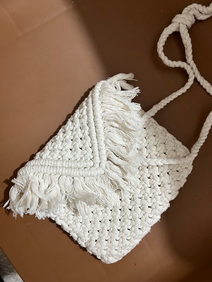 püsküllü örgü çapraz çanta, el yapımı. Bir mıknatısı çıkmış fotoğrafta gösterdim