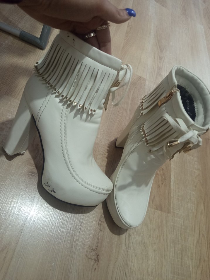 Beyaz deri yüksek topuklu kadın bot, nakışlı detaylar, püsküller ve tokalı kapanış ile dikkat çekiyor.
