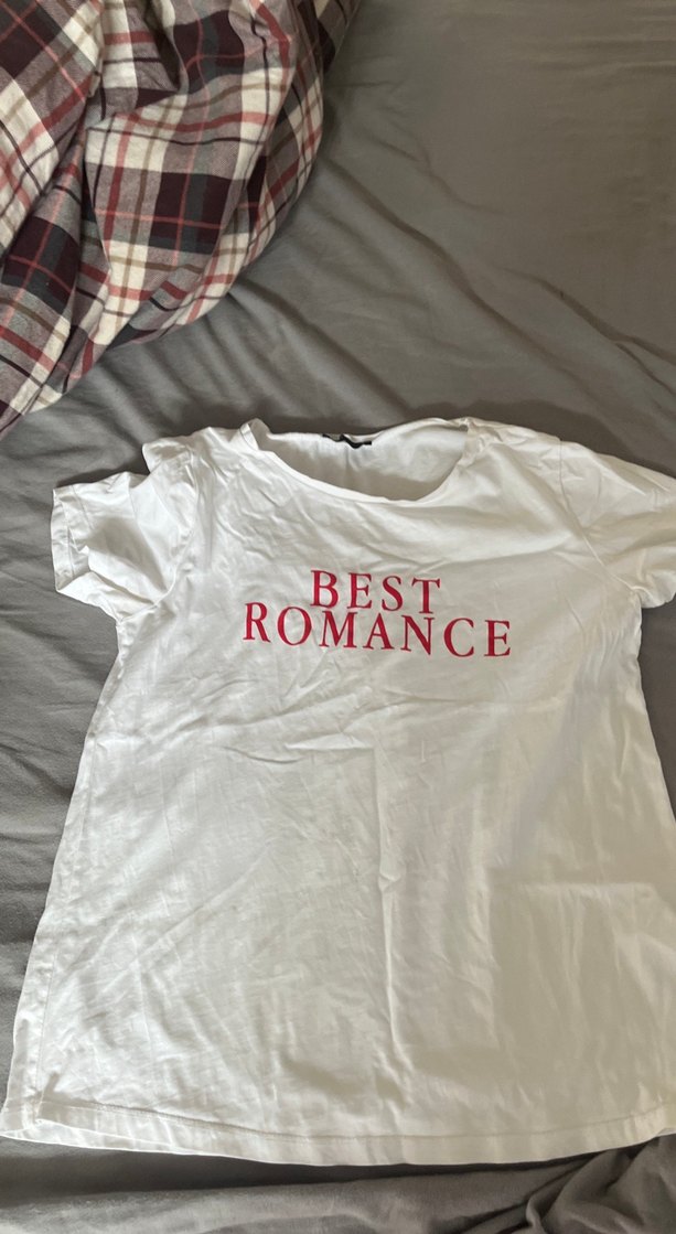 Pamuklu, beyaz, kısa kollu, yuvarlak yakalı ve rahat kesim kadın tişörtü. "BEST ROMANCE" baskısı romantik akşamlar için şık ve sade bir tercih.