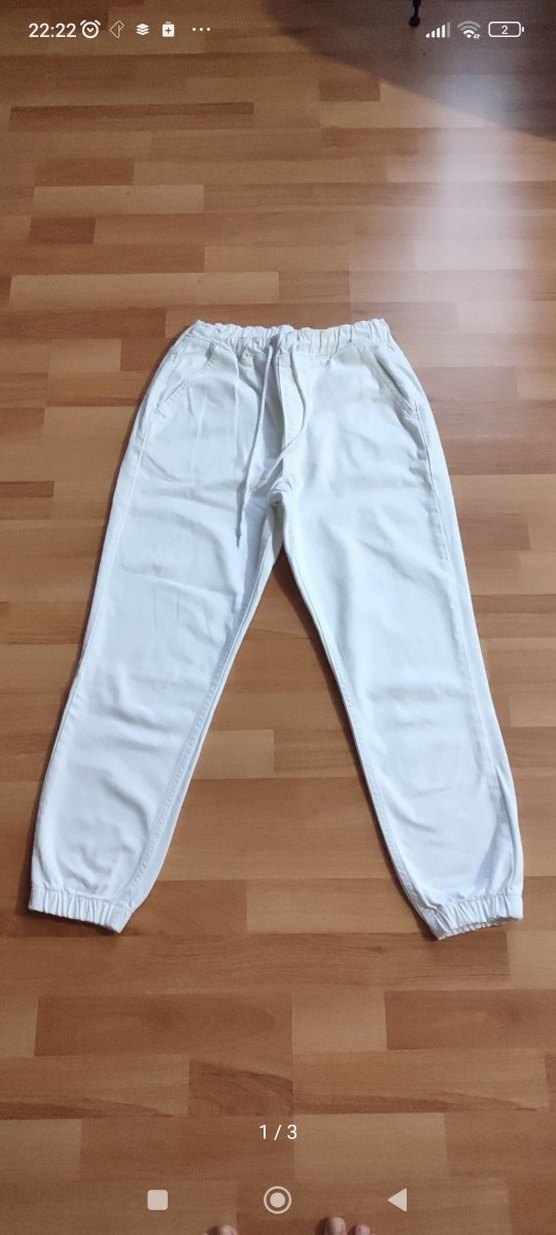 Beyaz renkli, elastik bel ve paça detaylı, rahat kesim denim kadın pantolon. Günlük ve şık bir dış mekan tarzı sunar.