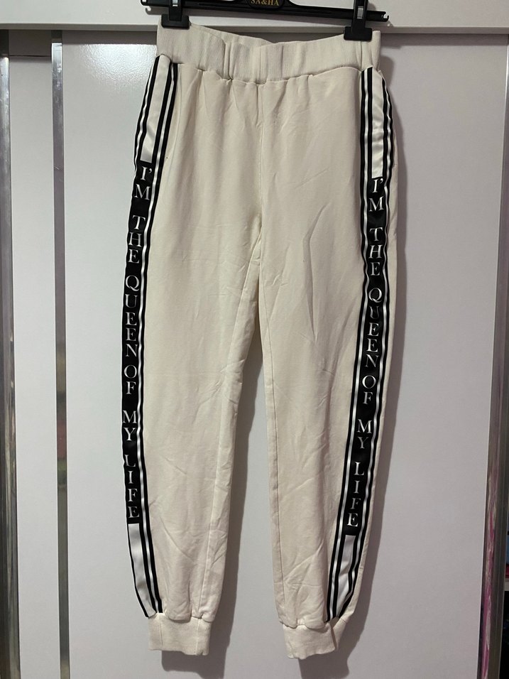 Beyaz, kuşaklı ve yanlarında yazılı şeritler bulunan, rahat kesim midi uzunlukta kadın eşofman altı. Yumuşak sentetik kumaştan, günlük kullanım için uygun. Bel 34 cm ama beli lastiklidir esniyor Boy 100 cm