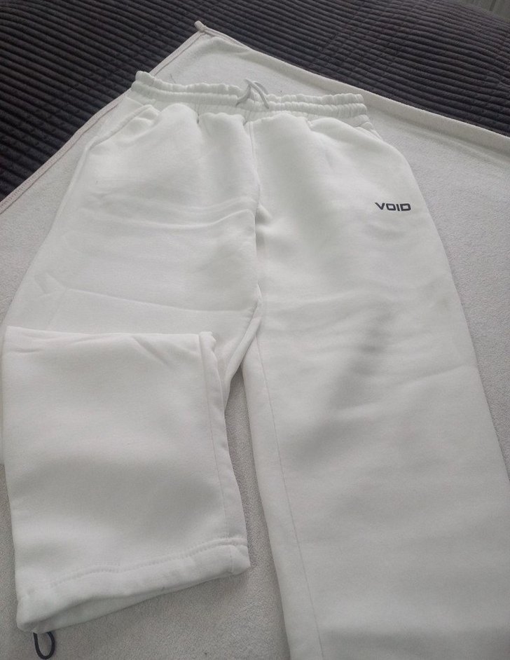 yumuşak ve sıcak kumaştan, rahat kesimde beyaz kadife eşofman. Gri 'VOID' yazısı . Casual ve spor tarzlar için uygundur.