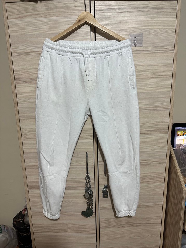 Beyaz, rahat kesim midi uzunlukta, yumuşak keten kumaştan, dış mekanlar için uygun kadın eşofman altı.