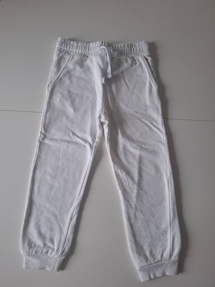 Beyaz renkte, rahat kesim ve lastikli bel bağlama ipli çocuk eşofman altı. Yan cepleri ve manşetli paçalarıyla sokak stiline uygun, yumuşak ve sıcak dokulu kumaştan.