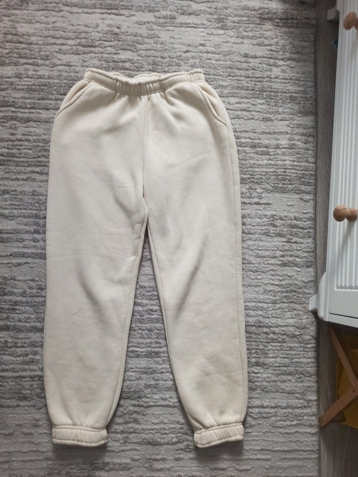 Yumuşak ve sıcak kumaştan, elastik bel ve bilek manşetli beyaz rahat kesim eşofman altı. Günlük sokak stiline uygun.