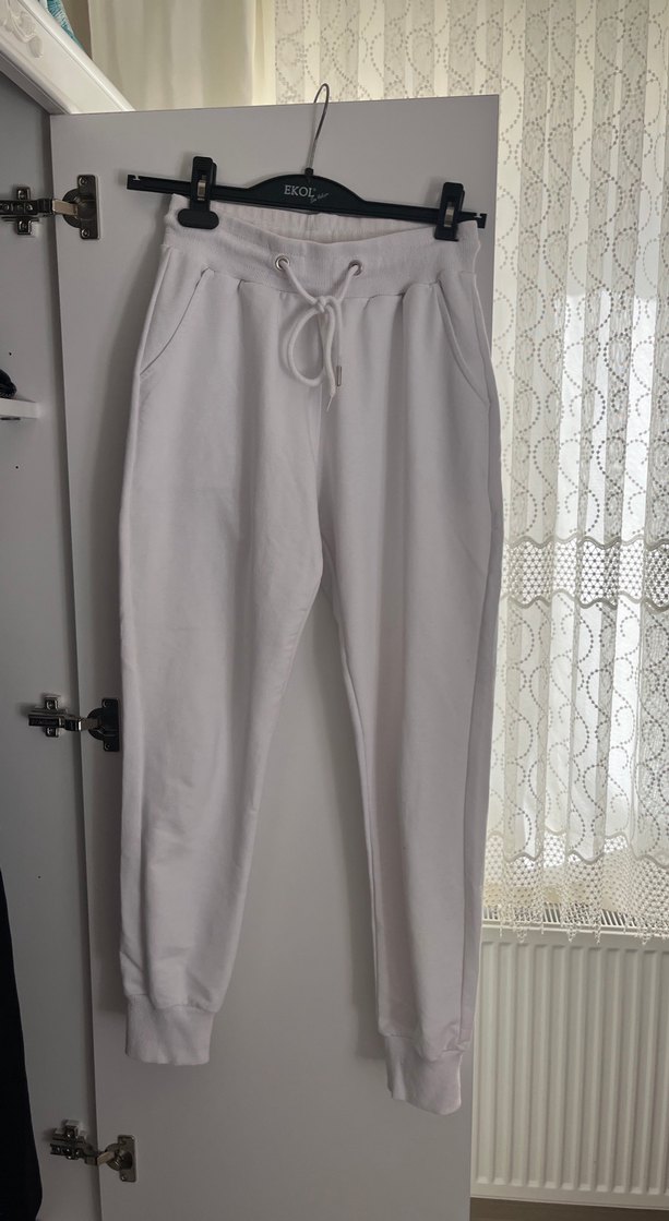 Beyaz , rahat kesim ve uzun boy kadın eşofman altı. Ayarlanabilir bağcıklı bel ve yan ceplerle günlük rahat ve şık görünüm sunar.