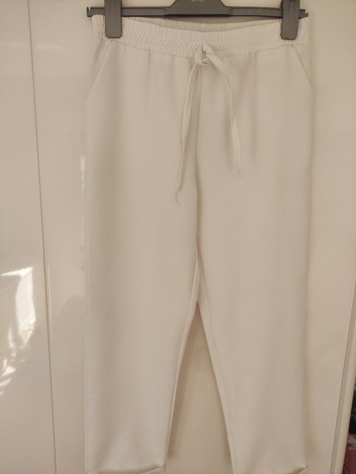 Beyaz, rahat kesim, bağcıklı bel detaylı, yumuşak ve sıcak kumaştan üretilmiş kadın pantolonu. Desensiz, sokak stili ve dış mekan kullanımı için uygundur. ️