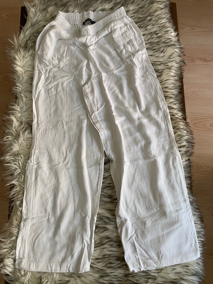 Midi boy, bol kesim beyaz pantolon. Bohem tarzıyla rahat ve şık, günlük kullanıma uygun. Keten değil ama baya dökülen rahat bi kumaş