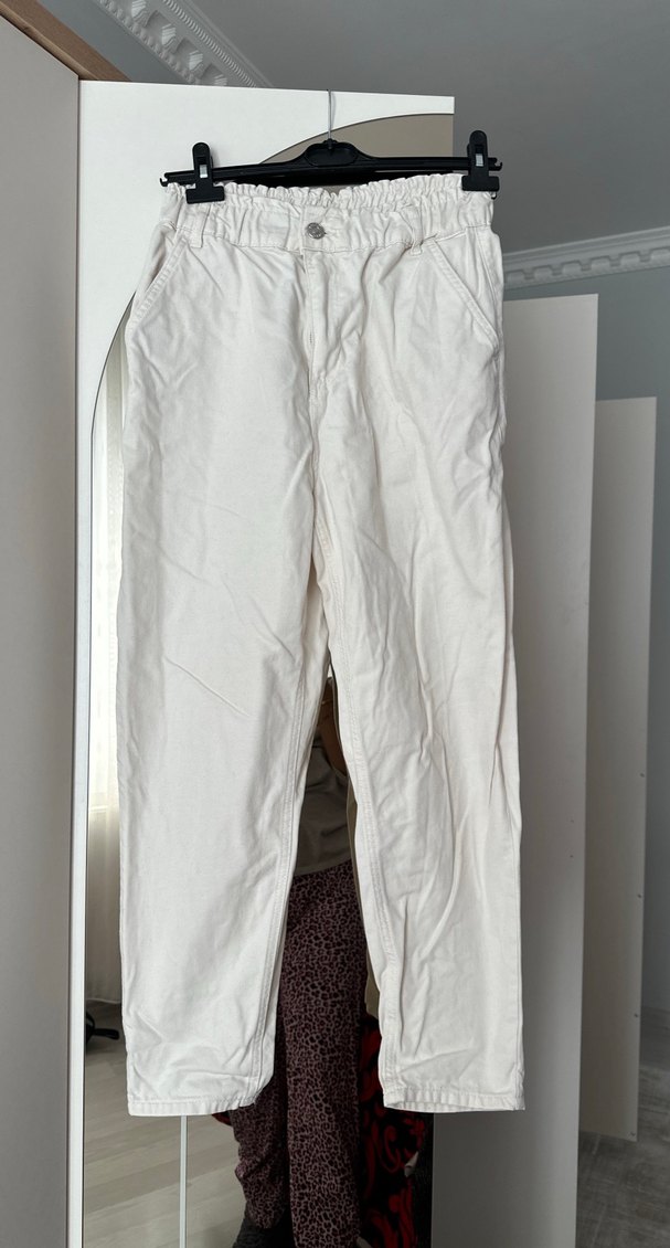 Beyaz keten midi pantolon, rahat kesimli ve elastik bel bantlı, gündelik kullanıma uygun şık ve sade tasarım sunar.