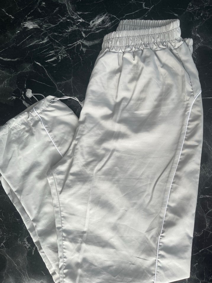 Beyaz renkte, sentetik kumaştan, elastik bel bantlı, rahat kesim kadın paraşüt kumaş eşofman, dış mekan kullanımına uygun.