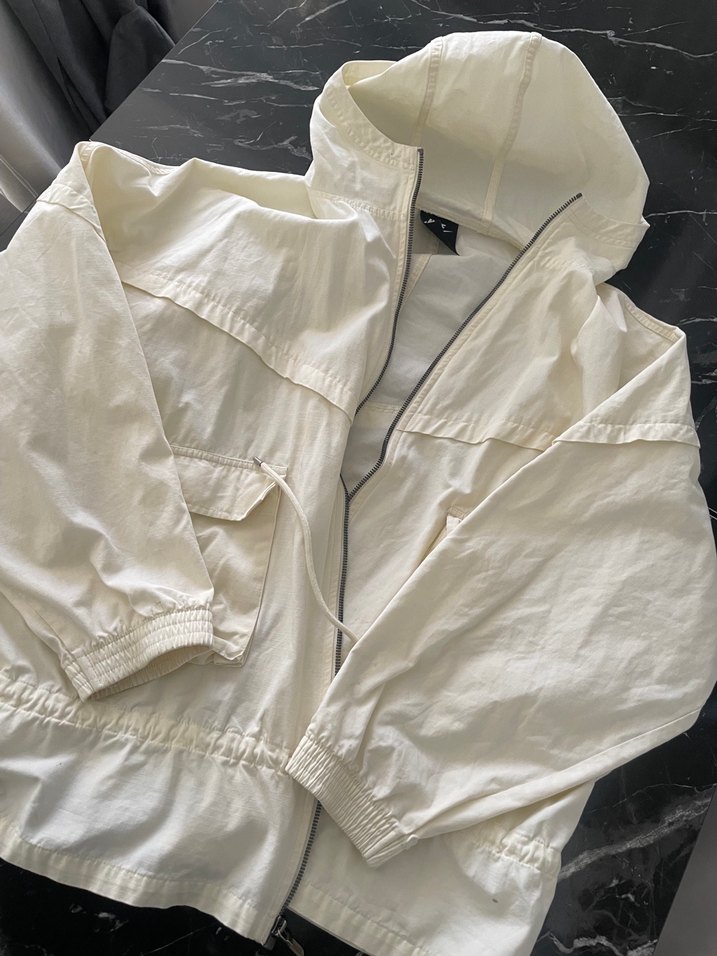 Beyaz kumaştan, yüksek yakalı ve uzun kollu, fermuarlı, bol kesim,günlük kullanıma uygun kadın ceket.