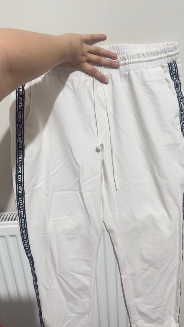 Beyaz pamuklu, elastik bel ve yan şerit detaylı bol kesim spor pantolon. Günlük kullanıma uygun rahat ve hafif.