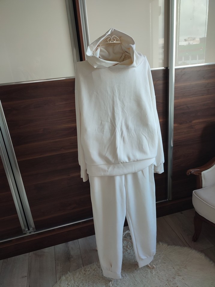Yumuşak dokulu , beyaz renkte, rahat kesim kadın takımı. Şapkalı, uzun kollu, normcore tarzıyla günlük kullanım için uygundur.