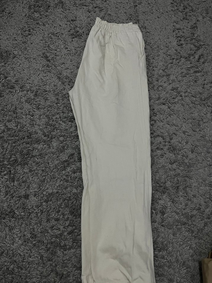 Beyaz keten kumaştan, rahat kesim ve normal boyda, lastikli bel detaylı günlük kullanıma uygun sade ve konforlu kadın pantolonu.