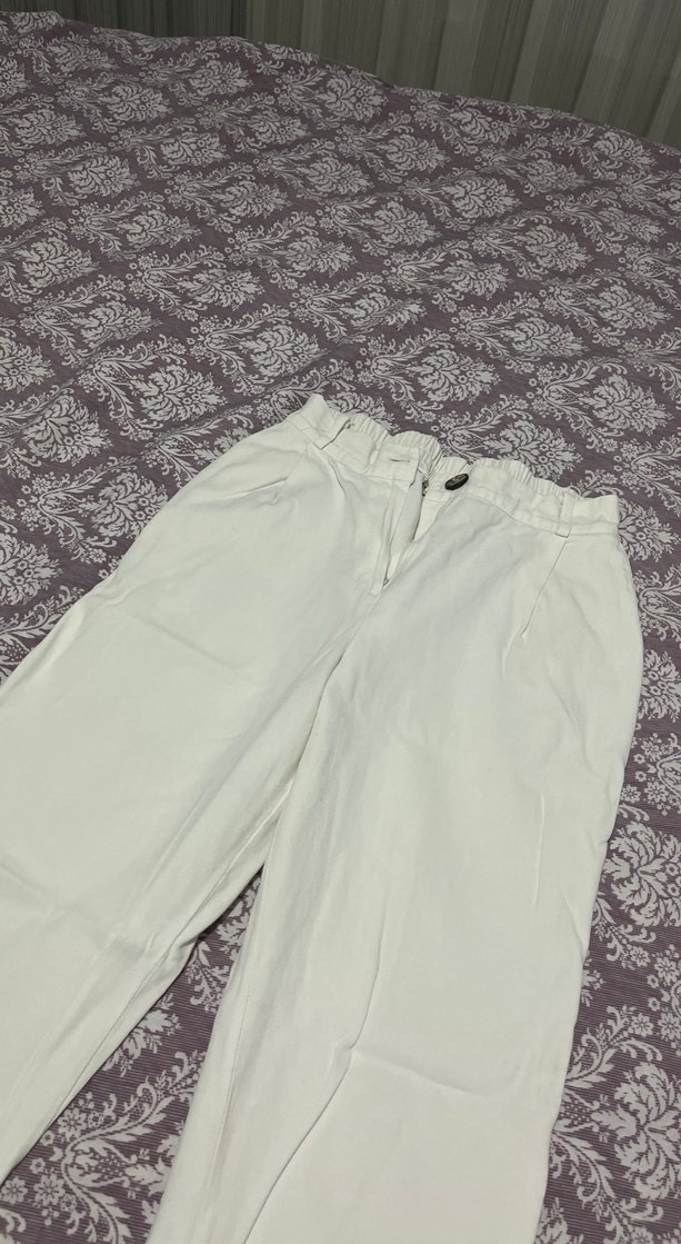 Beyaz keten kumaştan, rahat kesim ve midi boyda, günlük kullanıma uygun, trend ve rahat bir kadın pantolonu.