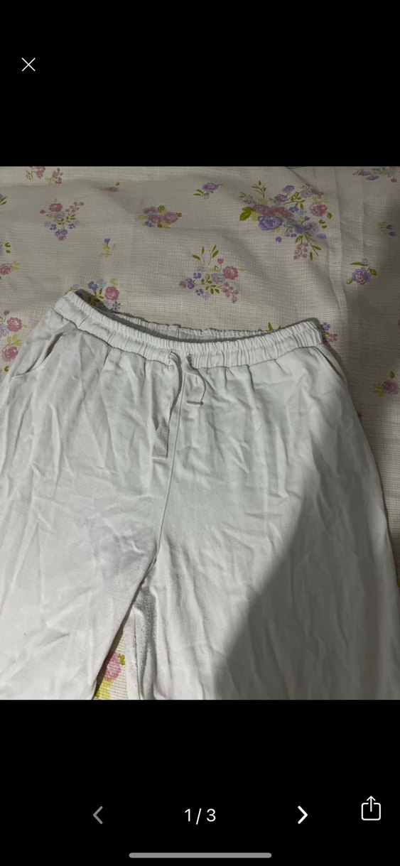 Beyaz keten kumaştan, rahat kesim ve bağcıklı lastik bel detayına sahip günlük kullanım için uygun kadın pantolon.