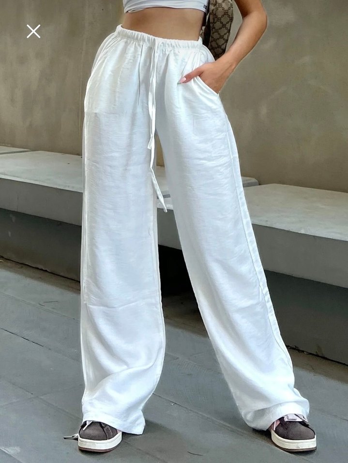 Beyaz keten kumaştan, rahat kesim ve lastikli bel detaylı pantolon. Yan cepler ve midi boyuyla gündelik şıklık sunar.