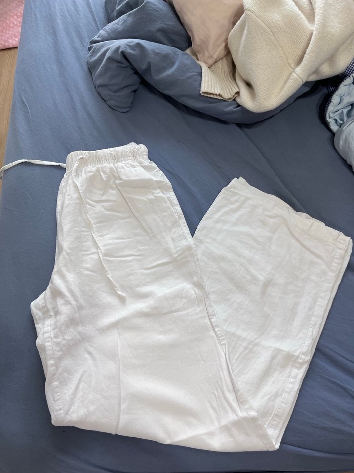 Beyaz keten pantolon, rahat kesim ve midi boyda, gündelik sokak modasına uygun zahmetsiz şıklık sunar.