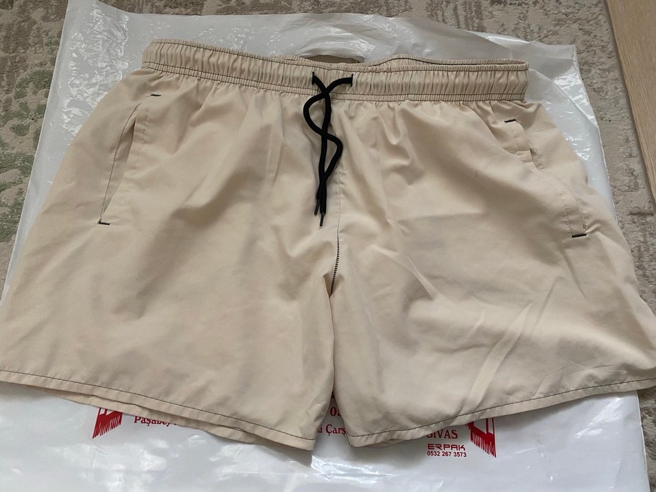 Beyaz renkli, rahat kesim midi uzunluğunda hamile şortu. Elastik bel kısmı siyah bağcıkla ayarlanabilir. Düz, sentetik kumaştan, plaj ve günlük kullanıma uygun. VAS yazısı mevcut.