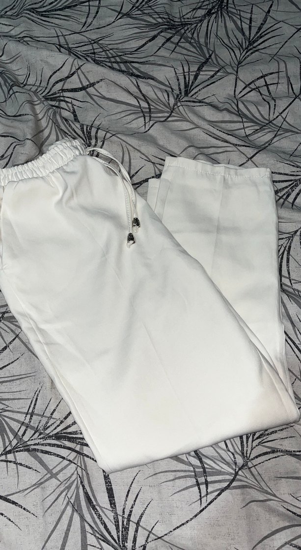 Beyaz, rahat kesim midi pantolon, elastik bel ve bağcık detaylı, şık ve rahat sentetik kumaştan üretilmiştir.