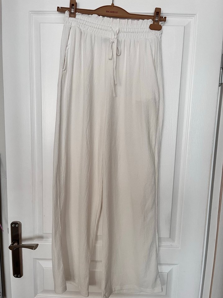 Beyaz akrilik kumaştan, bol kesim ve drapeli kadın pantolon. Minimalist ve günlük rahat stil için uzun ve desensiz tasarım. Biraz iç gösteriyor boy 100 cm bel lastik