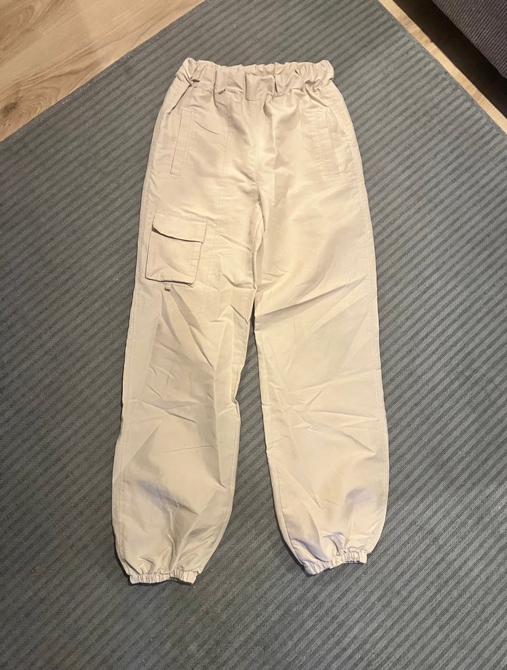 Beyaz keten kumaştan, rahat kesim ve midi boyda, elastik bilek detaylı kadın pantolonu, şık ve rahat bir görünüm sunar.