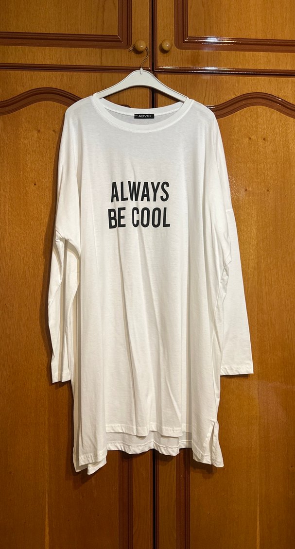 Uzun kollu, yuvarlak yakalı beyaz tişört, rahat kesim ve midi boyda. "ALWAYS BE COOL" baskılı, pamuklu kumaştan, günlük kullanıma uygun şık bir parça.
