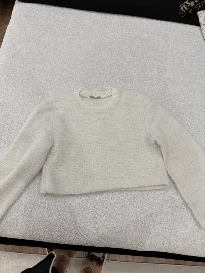 Beyaz kadın kazak, yuvarlak yaka, uzun kollu ve bol kesimdir. Yumuşak ve sıcak kumaştan örülmüş, sade ve desensiz tasarıma sahiptir. Normal midi boyu ile günlük kullanıma uygundur.