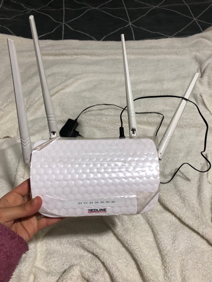Dört antenli beyaz Redline kablosuz router, geniş sinyal kapsama alanı sağlar. Çoklu bağlantı göstergelerine sahiptir.