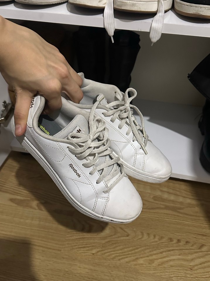 Beyaz Reebok spor ayakkabılar, bağcıklı tasarımı ve stiletto topuklu tabanıyla sokak stilini spor konforuyla buluşturuyor.