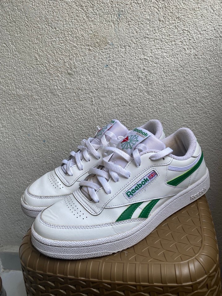 Yeşil detaylı beyaz Reebok spor ayakkabı, platform topuk ve cırt cırtlı tasarım, trend sokak stili için uygun.