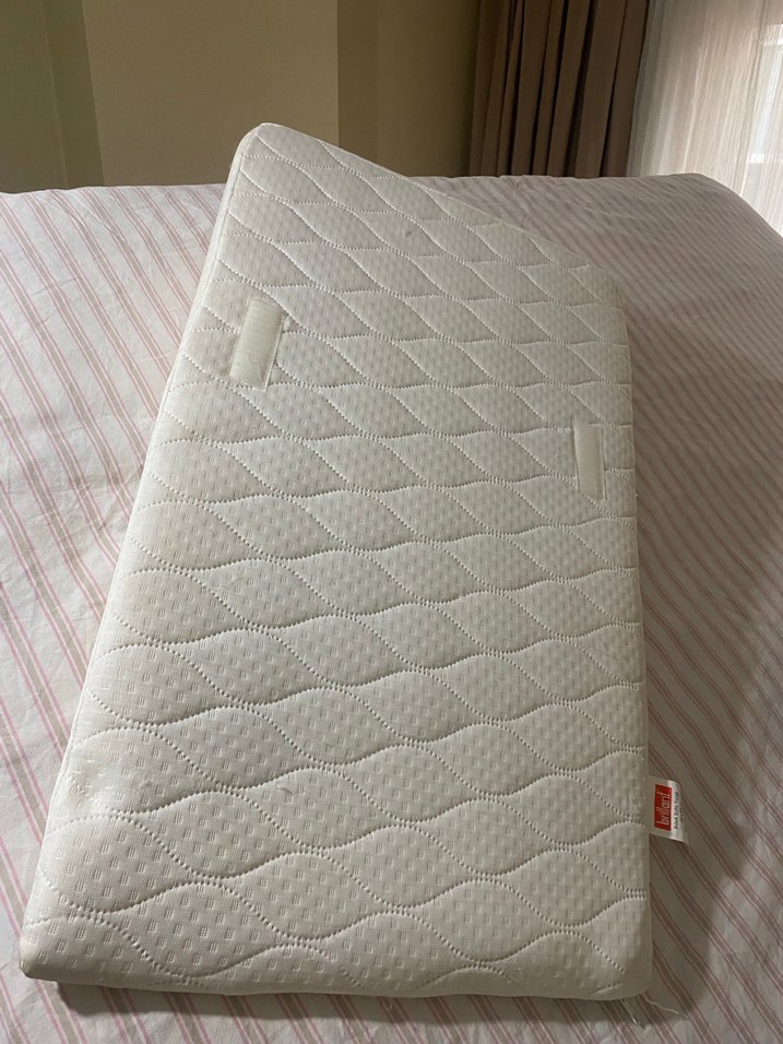Yumuşak, beyaz pastel renkte, konforlu kapitone yüzeye sahip bebek yatağı. Taşıma için iki kumaş kulp içerir. ️
