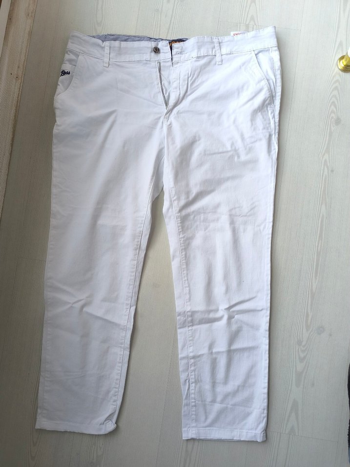 Yumuşak pamuk kumaştan, parlak beyaz renkte, regular fit ve normal boyda erkek pantolon. Günlük rahat kullanıma uygun, sokak tarzı görünüm sunar.