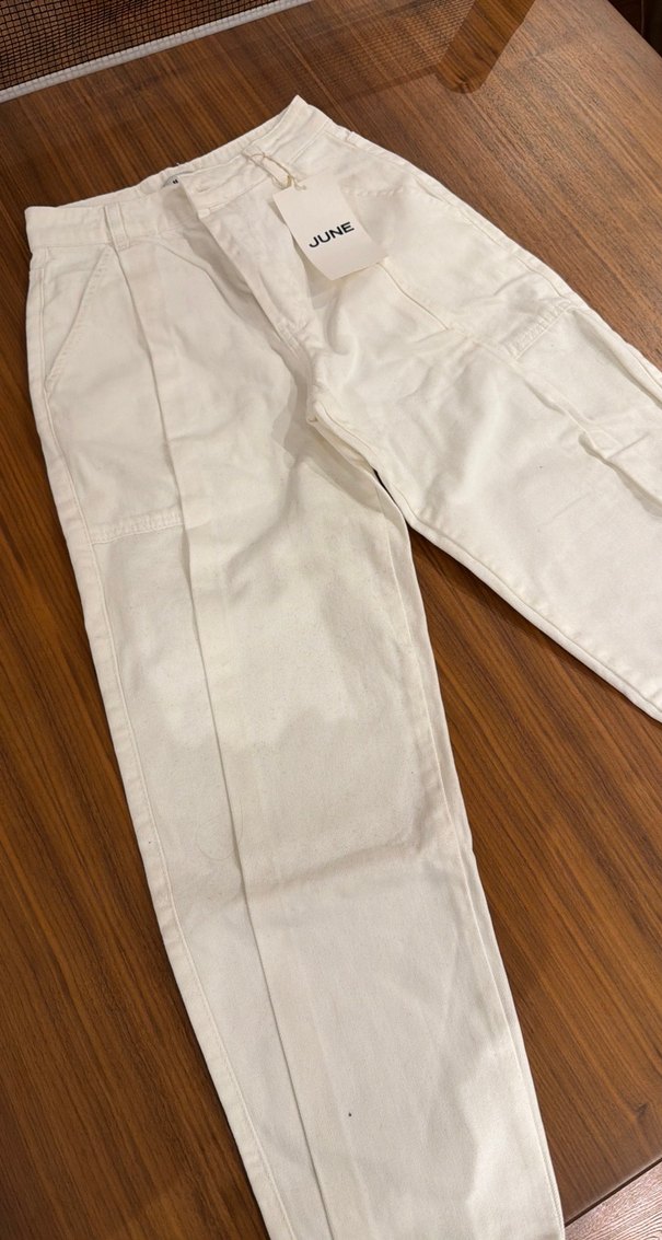 Beyaz pamuk kumaştan, regular fit ve midi boyda, desen içermeyen sade ve rahat günlük kullanıma uygun kot pantolon.
