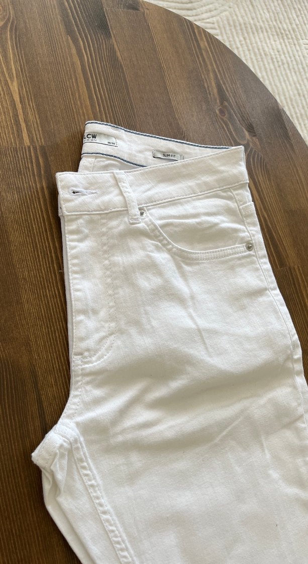 Yumuşak pamuk kumaştan beyaz, regular fit kadın kot pantolon. Minimalist ve zahmetsiz şıklık sunar, günlük kullanım için uygundur.