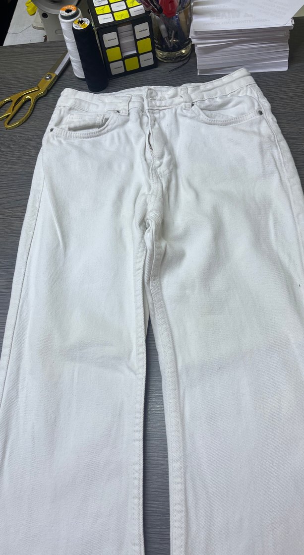 Pamuklu kumaştan beyaz, regular fit kadın kot pantolon. Midi boy, desen içermeyen minimalist tasarım, günlük kullanım için uygun. Rahat ve şık.