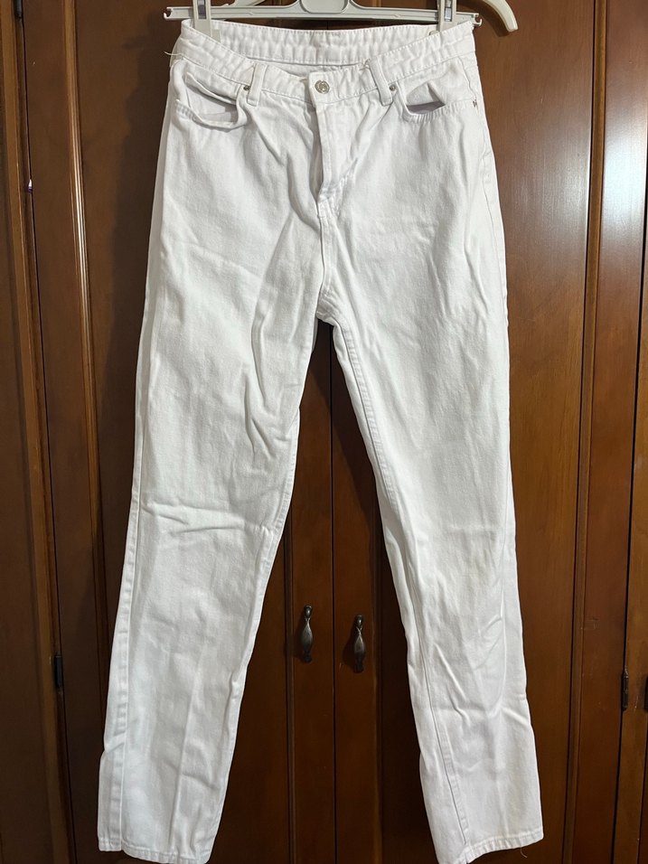 Beyaz, regular fit, pamuklu, midi boy kadın kot pantolon. Minimalist ve normcore tarzıyla günlük kullanıma uygun, desensiz ve rahat şıklık sunar. Harika bir mom jean inanılmaz rahat kalıbı bir tık dar ama cok güzeldir bende benzeri olduğu için satıyorum
