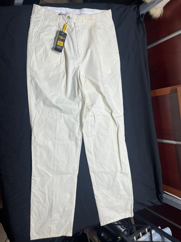 Beyaz renkte, pamuklu kumaştan, regular fit ve kemerli erkek pantolonu. Sokak stili ve günlük dış mekan kullanımı için uygundur.