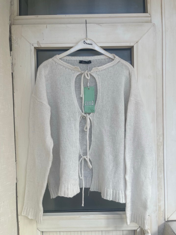 Beyaz renk, bağlamalı şık bir hırka. Günlük kombinlerinizde rahatlıkla kullanabilirsiniz