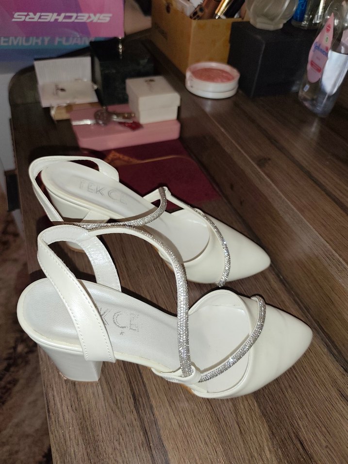 Yalnızca bir saat kadar nikahta giyildi. Topuk 9 cm. Altında isimler yazılıdır. Beyaz kadın topuklu ayakkabılar, tokalı kayışlara ve blok topuğa sahiptir. Kauçuk malzemeden üretilmiş, minimalist ve çağdaş bir stile sahiptir. ✨ Nikah, düğün, gece, davet gibi özel günlerde kullanabilirsiniz. Oldukça rahat ve çok iyi durumdadır.