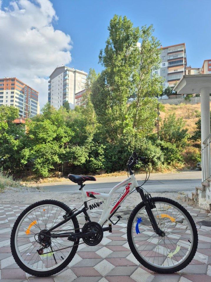 Az kullanılmış depoda bekleyen bir bisiklet 24 jant ,21 vites.Uzun süre kullanılmadığı için bekleme esnasında ön tekerde çatlaklar oluşmuş o yüzden fiyati uygun tutulmuştur.