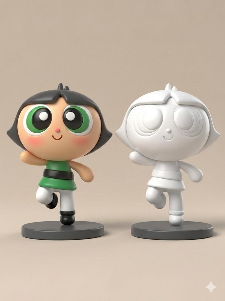 Bu action figure, açık beyaz renkte dinamik bir pozda ve büyük gözlü neşeli bir karakteri yansıtıyor. Yuvarlak tabanda duruyor.