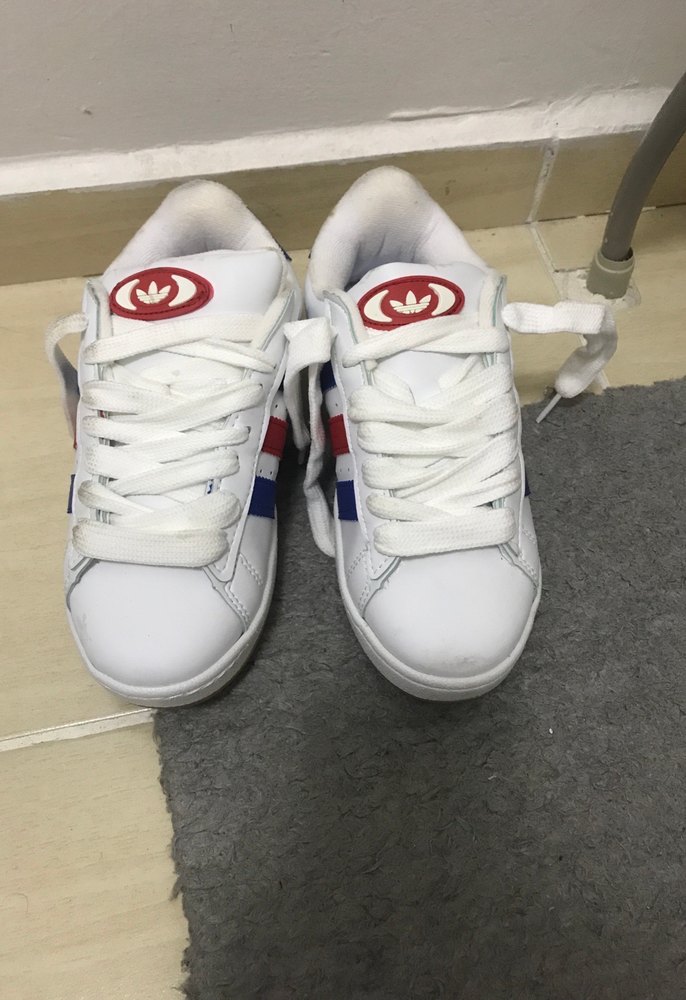 Beyaz renkte, renkli detaylara sahip, bağcıklı ve lastik tabanlı kadın spor ayakkabısı, stiletto topuklu, günlük kullanım için uygundur.
