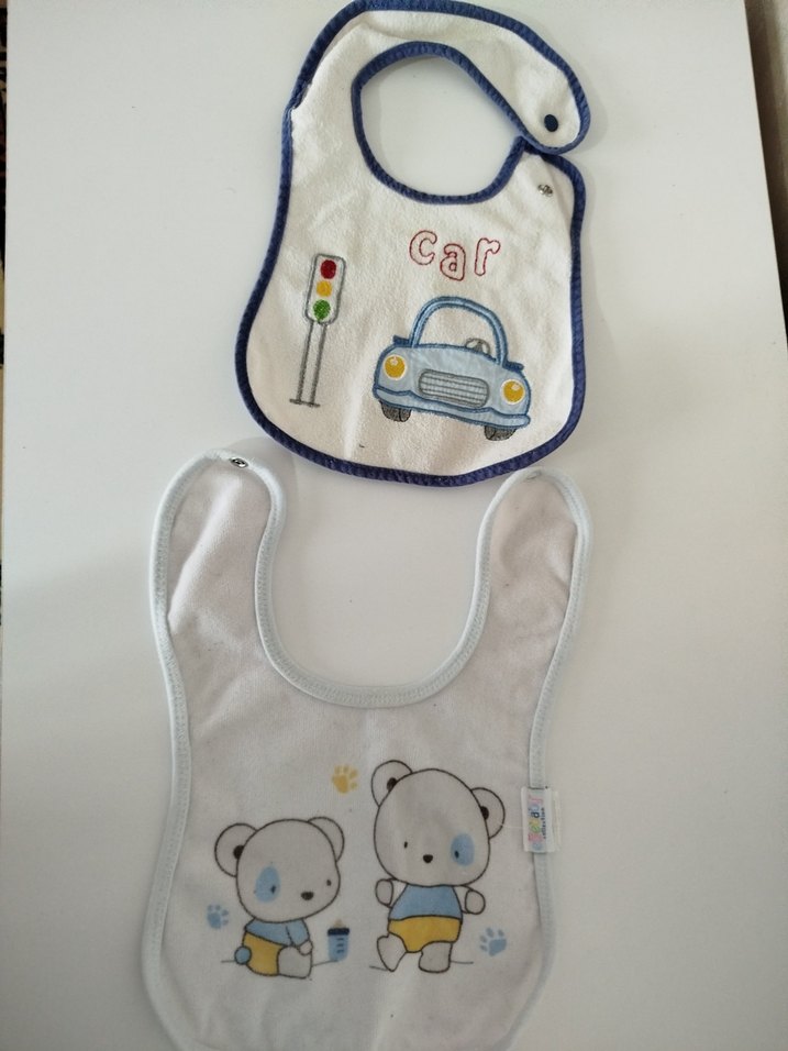 Renkli baskılı iki beyaz bebek önlüğü; biri araba ve trafik ışığı, diğeri iki ayı figürlü. Yumuşak kumaşlı ve kolay çıtçıtlı.