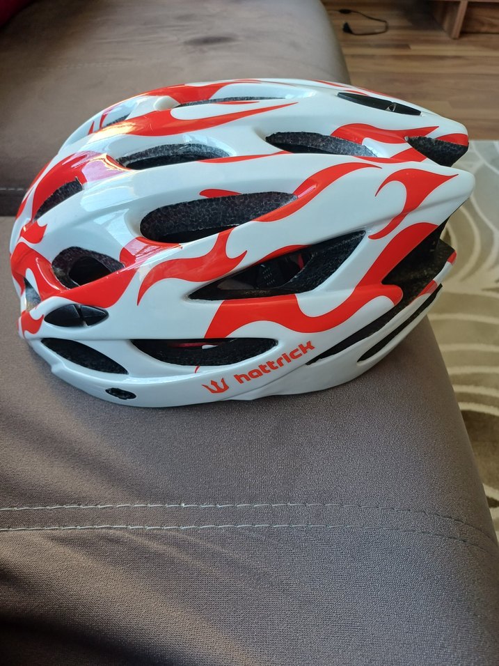 Beyaz renkte, plastik malzemeden yapılmış, renkli alev desenli baskılı biker kask. Elastik detaylara sahiptir. Moda öncülerine uygun avant-garde tarz.