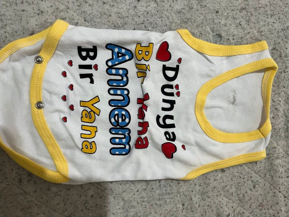 Beyaz renkte, renkli baskılı "Bir Yana, Annem" yazılı çocuk atleti. Sarı yaka ve kol kenarları detaylıdır. ❤️