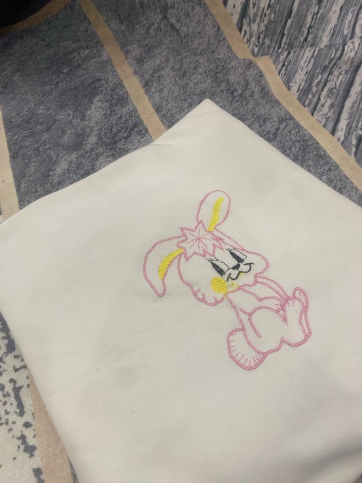 Yumuşak ve sıcak kumaştan yapılmış, beyaz renkli ve sevimli tavşan baskılı çocuk battaniyesi.